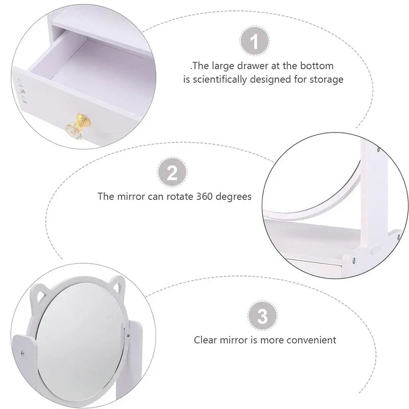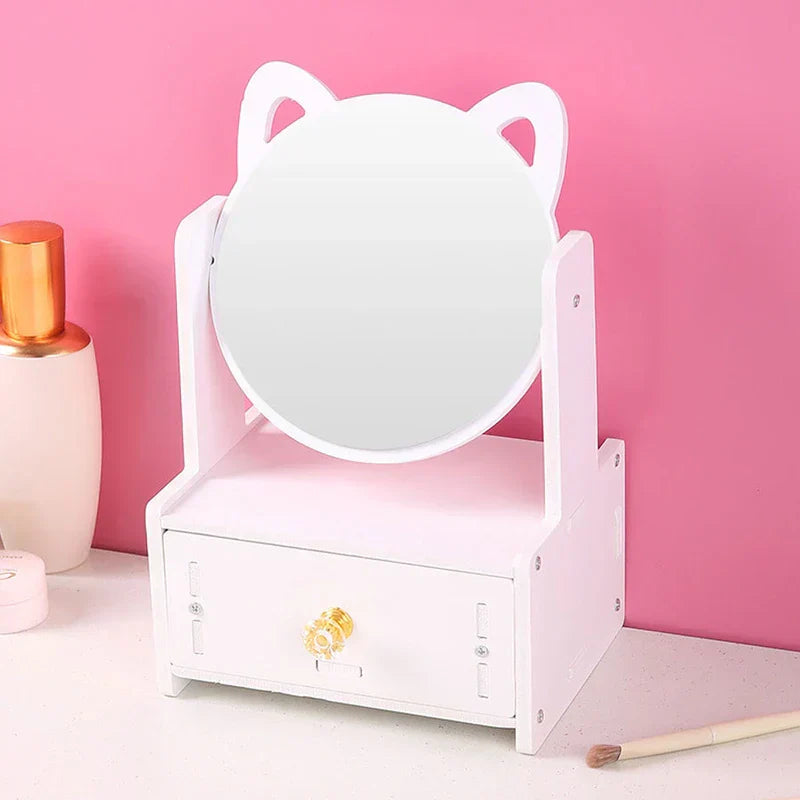 Add a touch of cuteness to your vanity with this Cat Ear Makeup Mirror. Features adorable cat ears and a single drawer for small item storage. Offered by New Home Goods.