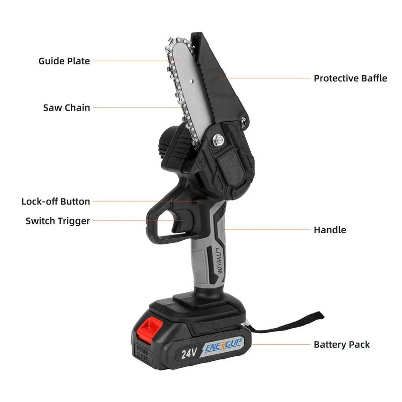 Tackle small cutting jobs with this Cordless Mini Chainsaw featuring a Light. Compact, battery-powered design with an integrated light for visibility. From New Home Goods.