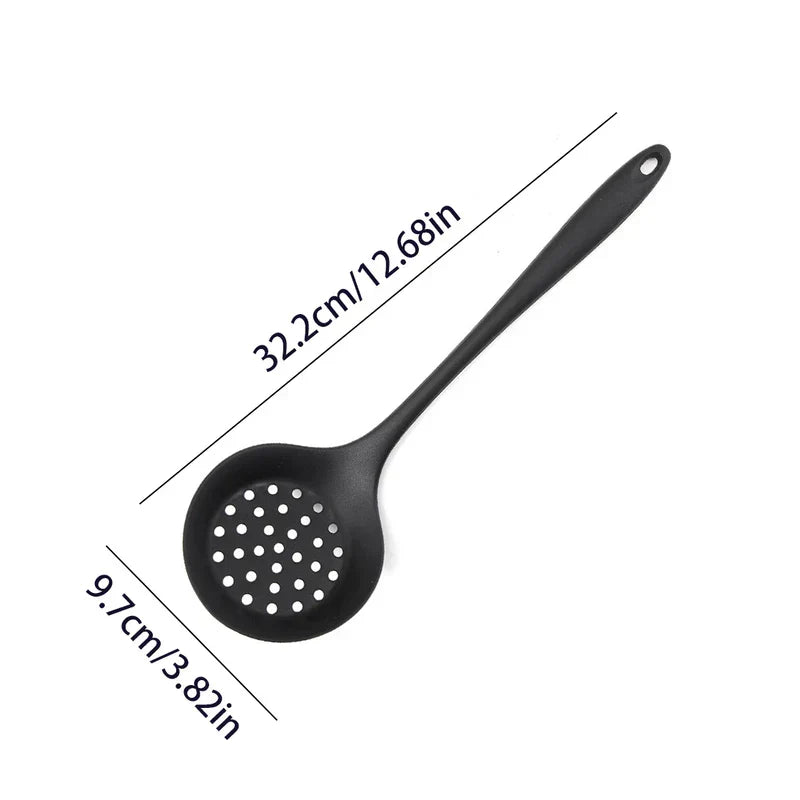 Skim and strain foods easily from liquids using this Silicone Slotted Spoon Skimmer. Heat-resistant silicone allows for use in hot pots. Offered by New Home Goods.